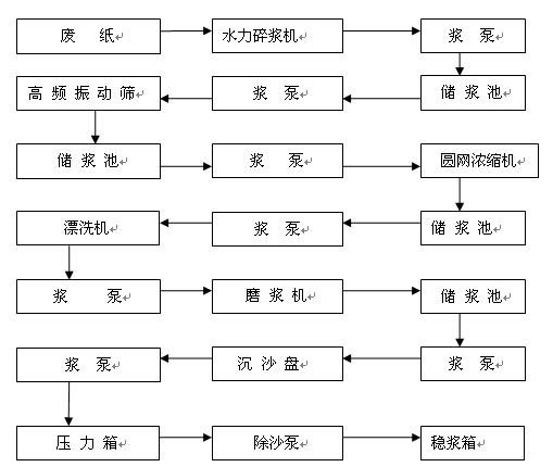 由廢紙進(jìn)入水力碎漿機(jī),水力碎漿機(jī)對(duì)廢紙進(jìn)行作打漿脫墨,打漿脫墨后的紙漿流入漿池;由提漿泵把紙漿從漿池提入高頻振動(dòng)篩,高頻振動(dòng)篩起到篩選雜物分離作用;篩選后到流入漿池,再由漿泵提入漂洗機(jī),作用是洗漿干凈,漂白;漂白后自動(dòng)流入漿池;再由漿提入磨漿機(jī),經(jīng)磨漿磨成細(xì)漿后,自動(dòng)流入漿池再由漿泵提入沉沙盤(pán),沉沙盤(pán)的作用是將沙灰等雜質(zhì)沉淀分離出去,后制成純漿,再由除沙泵提入穩(wěn)漿箱,穩(wěn)漿箱作用是調(diào)和漿的濃度,之后自動(dòng)流入網(wǎng)槽后,由網(wǎng)籠毛毯帶漿進(jìn)入烘缸。(烘缸是起烘干作用)后進(jìn)入成品卷紙。卷紙后進(jìn)入復(fù)卷機(jī),復(fù)卷的作用是起復(fù)卷打孔壓花作用。由大卷復(fù)卷成小卷,后進(jìn)入分切機(jī),分切機(jī)的作用是起分切,不同規(guī)格長(zhǎng)短作用,后經(jīng)包裝到成品。注:鍋爐是起到熱氣的作用,送入烘缸起到干燥紙的作用。